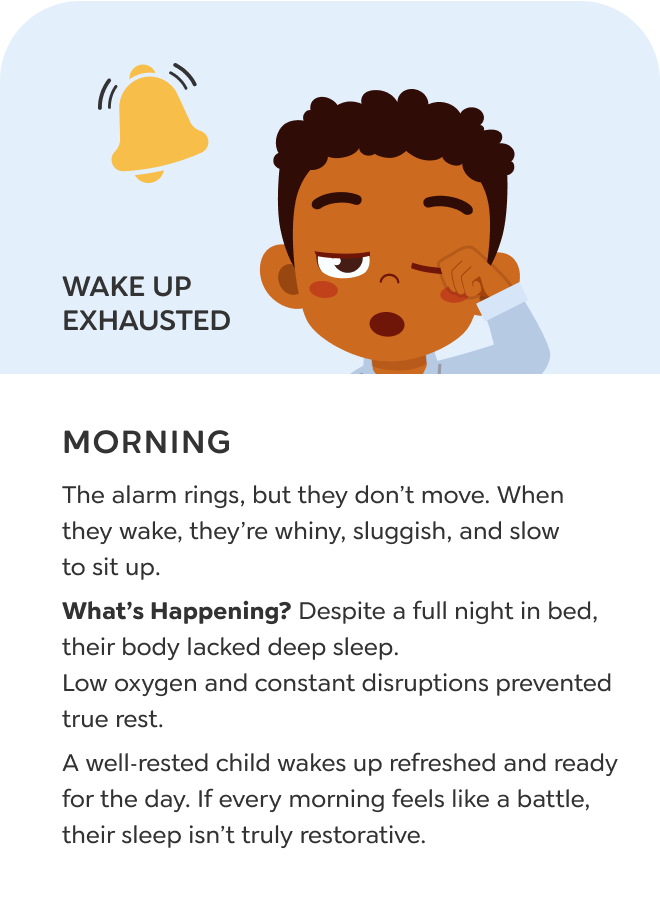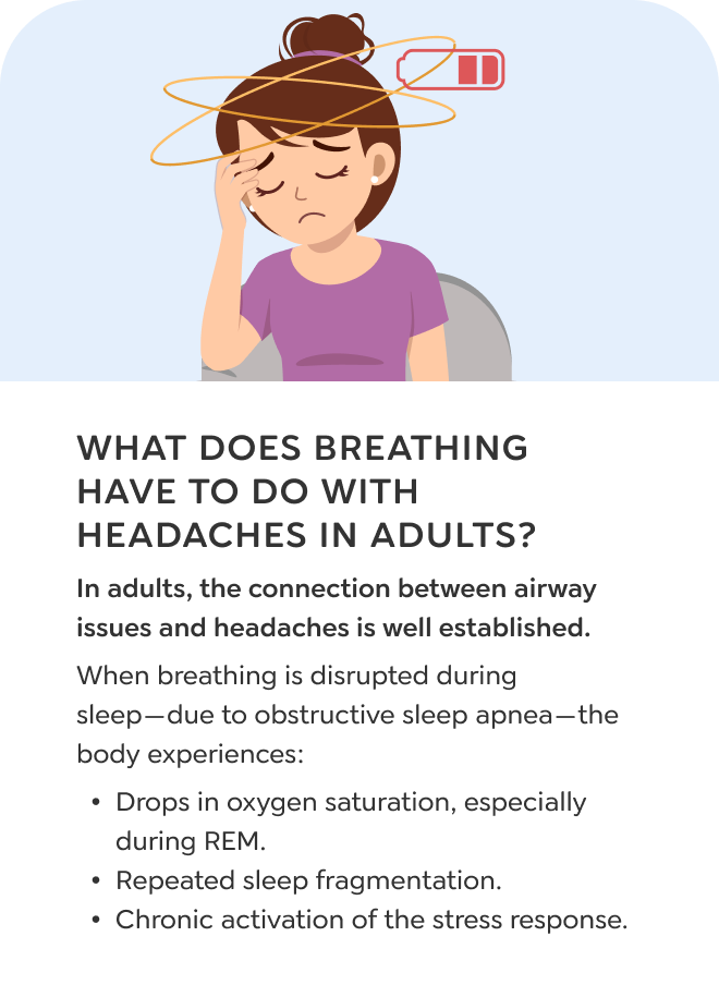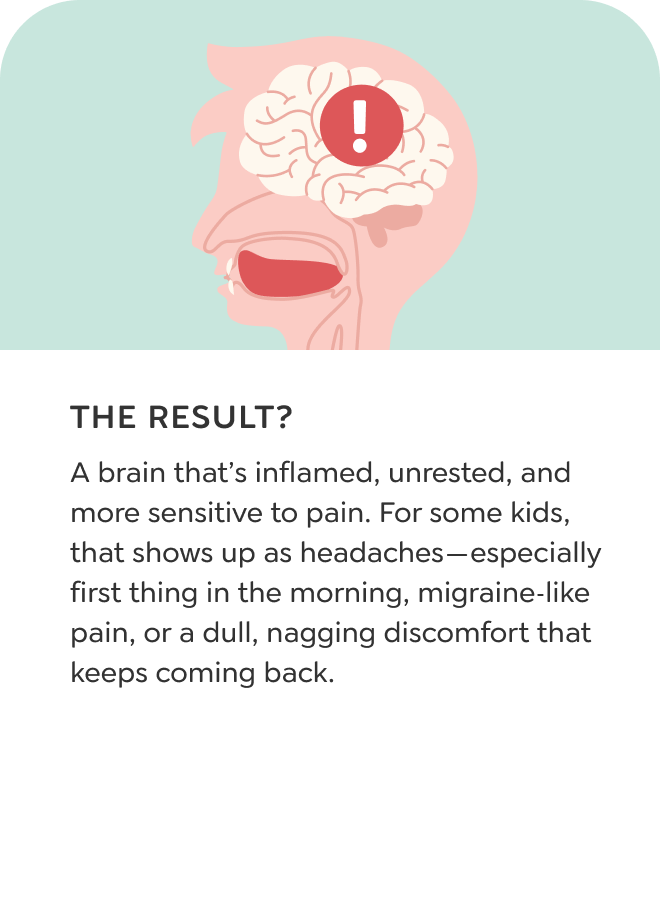 Your child starts the day with pressure or pain behind the eyes. Poor sleep and low oxygen can strain the brain. If breathing is off at night, the nervous system stays tense. That tension can lead to morning headaches.