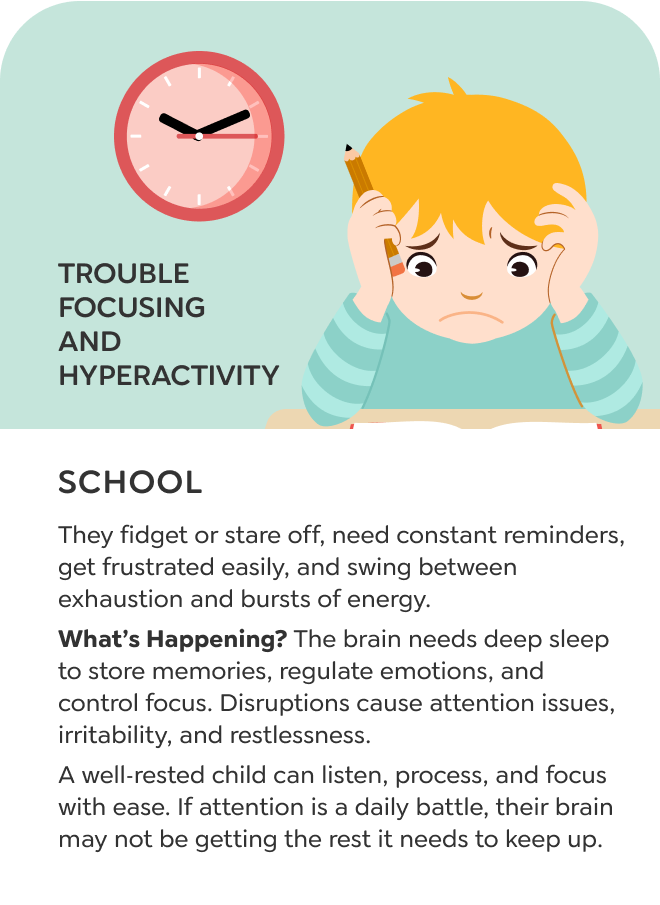 Your child bounces between tasks, acts impulsively, or seems constantly restless. Poor sleep can overstimulate the nervous system. What looks like attention issues may start with breathing problems at night.