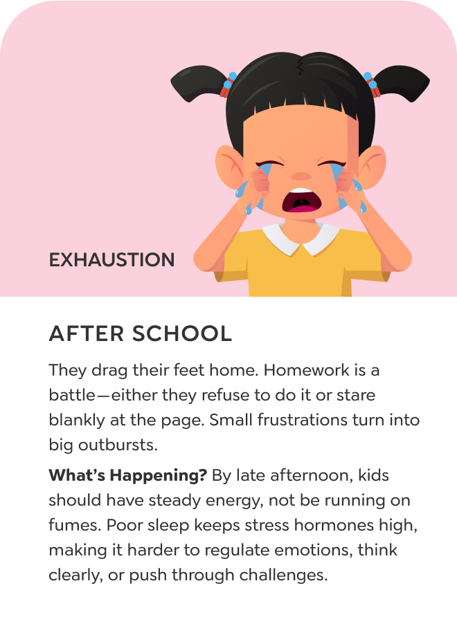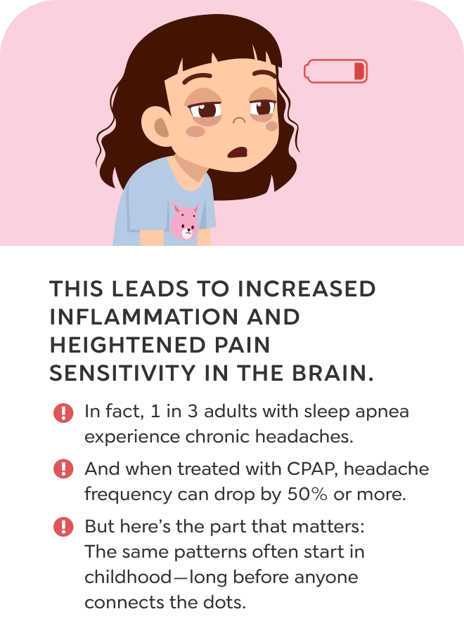 Instead of reaching deep, restorative sleep, the nervous system stays activated, the brain remains unrested, and inflammation builds. This can result in morning headaches, dull pressure behind the eyes, or discomfort that comes and goes throughout the day. The child may not always describe it as a headache. They may say they feel tired, irritable, or want to avoid light and sound.