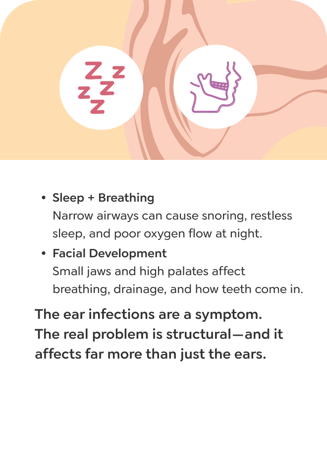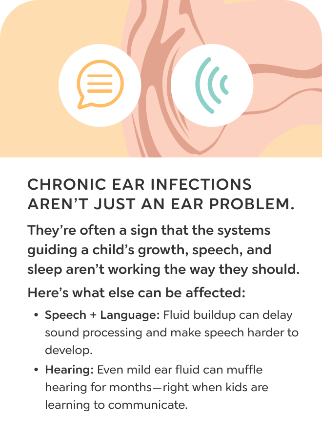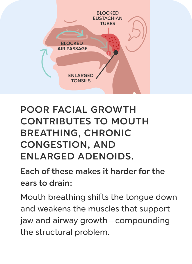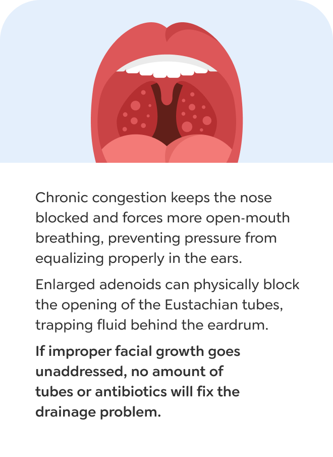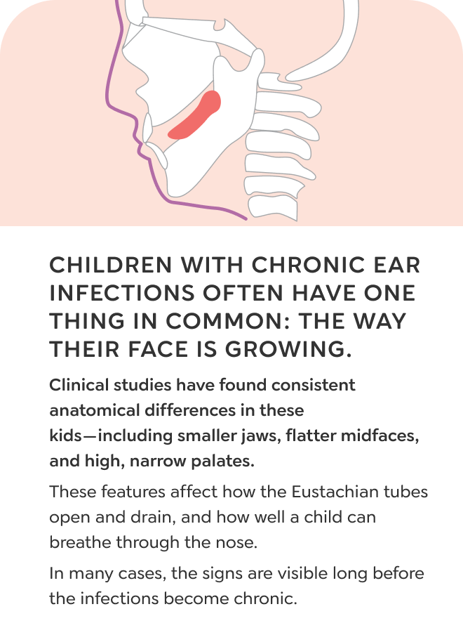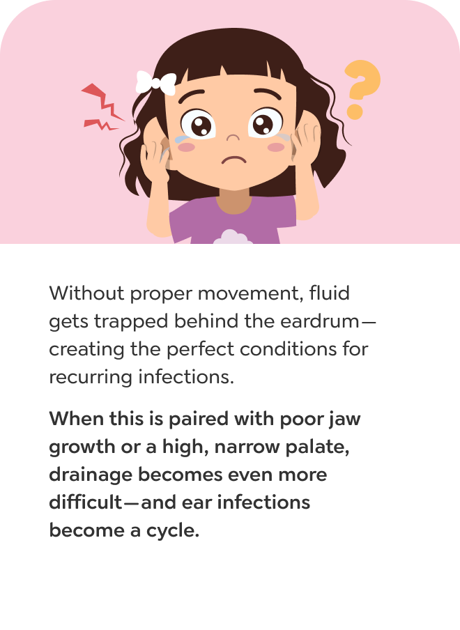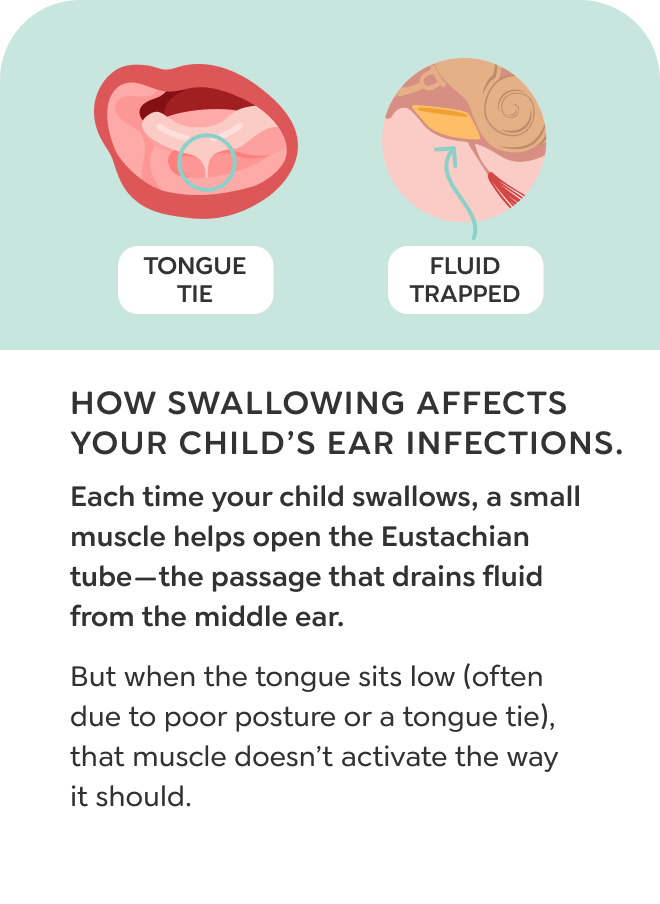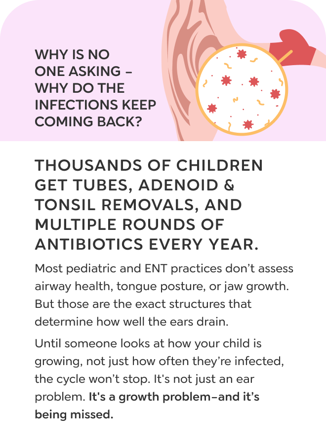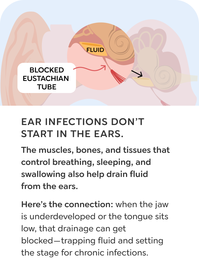 Antibiotics and ear tubes may relieve symptoms temporarily, but they don’t address the cause. When swallowing and tongue posture are not corrected, fluid continues to build. That’s why the infections often return.