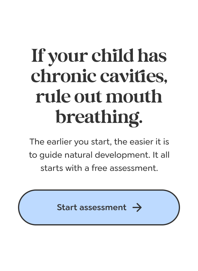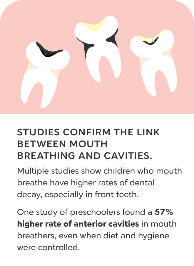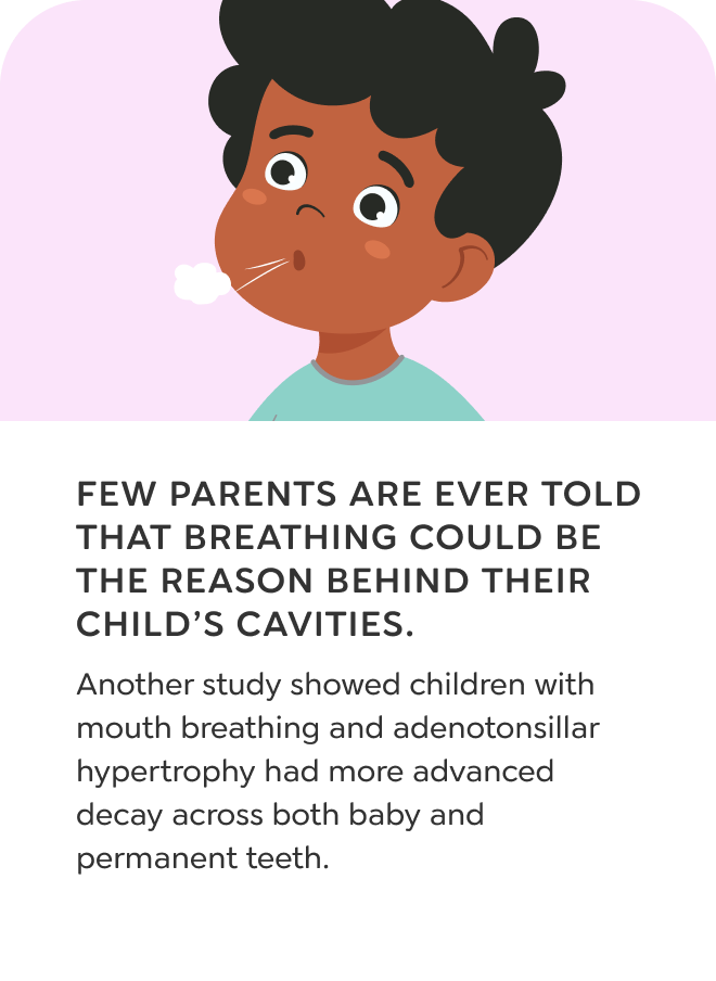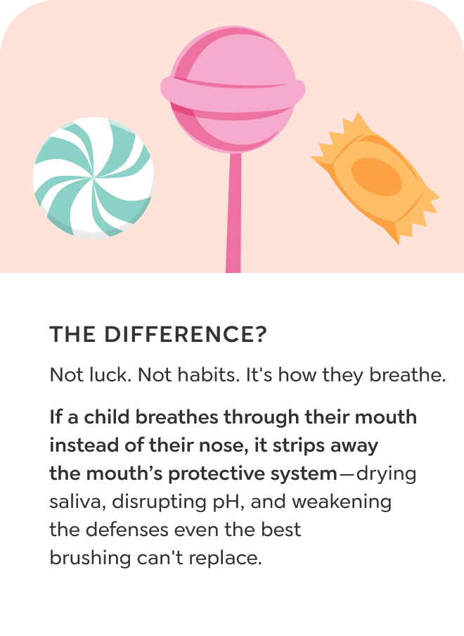 >When a child has frequent cavities despite good brushing and a healthy diet, the problem may not be dental hygiene. It is often a sign that the child is breathing through the mouth, especially during sleep, and that the structures supporting nasal breathing need to be evaluated.