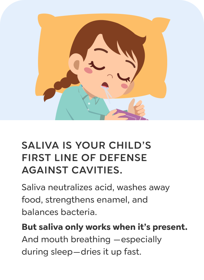 Your child brushes well, eats healthy, and still gets decay. The issue might be dry mouth. If they breathe through the mouth, saliva dries up. That leaves teeth exposed to acid and bacteria with no protection.