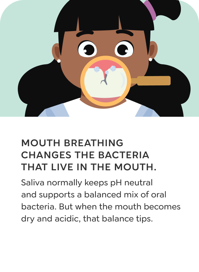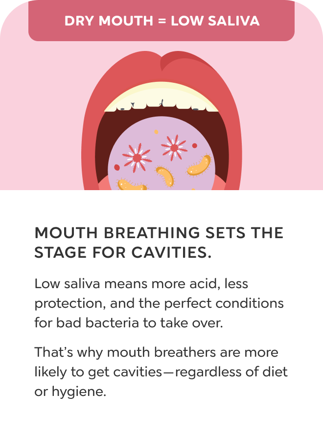 Mouth breathing dries out the teeth and reduces saliva. Saliva is essential for protecting enamel, neutralizing acid, and washing away food particles. When the mouth stays open during the day or night, that saliva barrier is lost. Without it, bacteria and acid have direct contact with the teeth for longer periods.