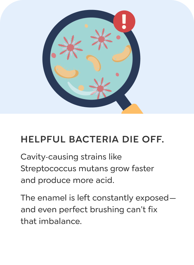 Airflow through the mouth also changes the balance of oral bacteria. Harmful bacteria thrive in dry, oxygen-exposed environments. As the protective system breaks down, cavities become more common and harder to prevent.