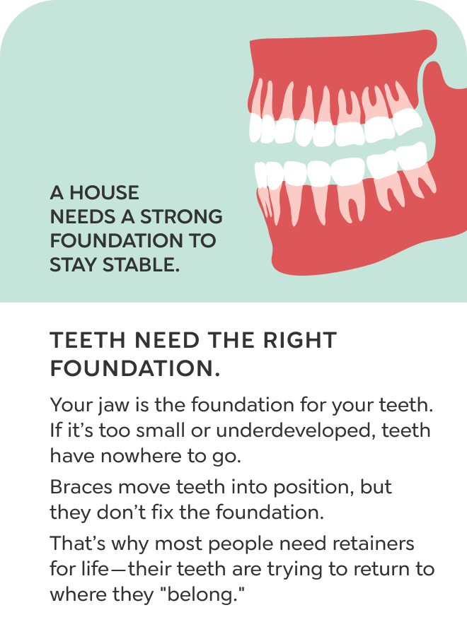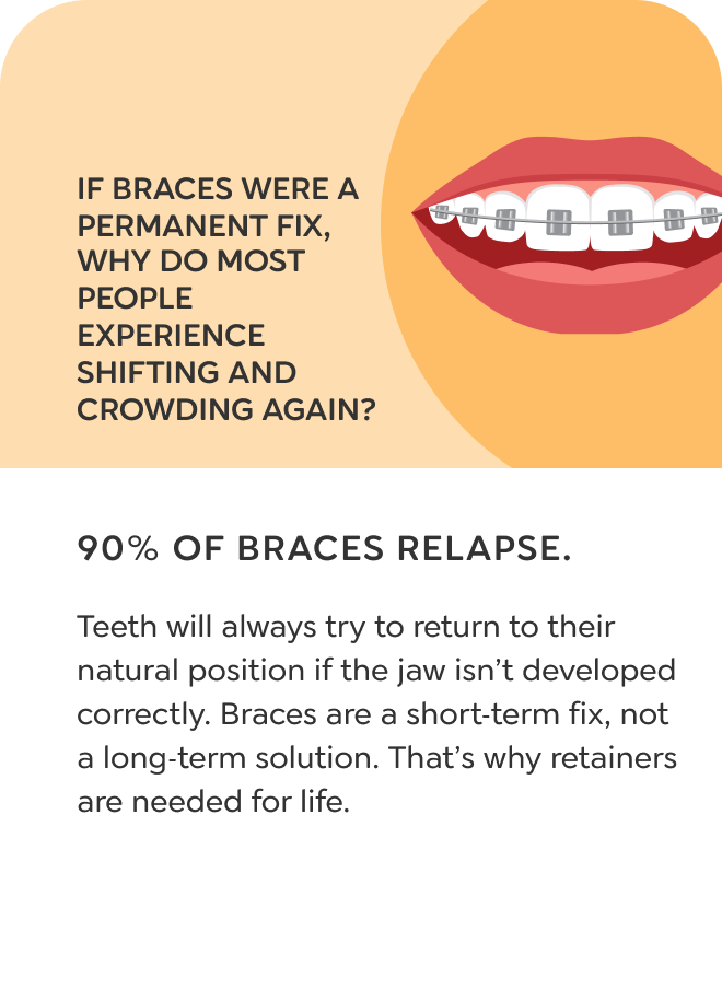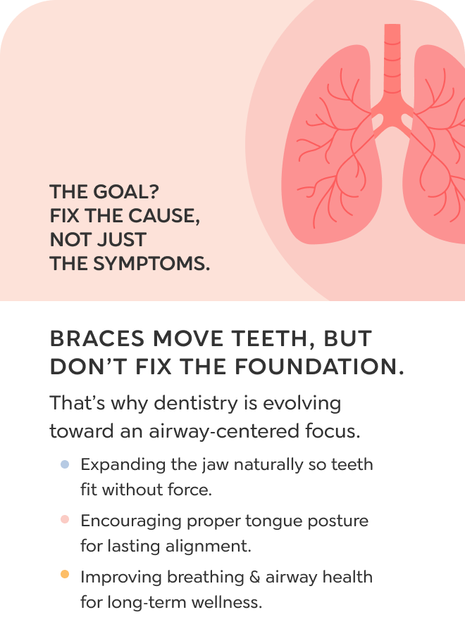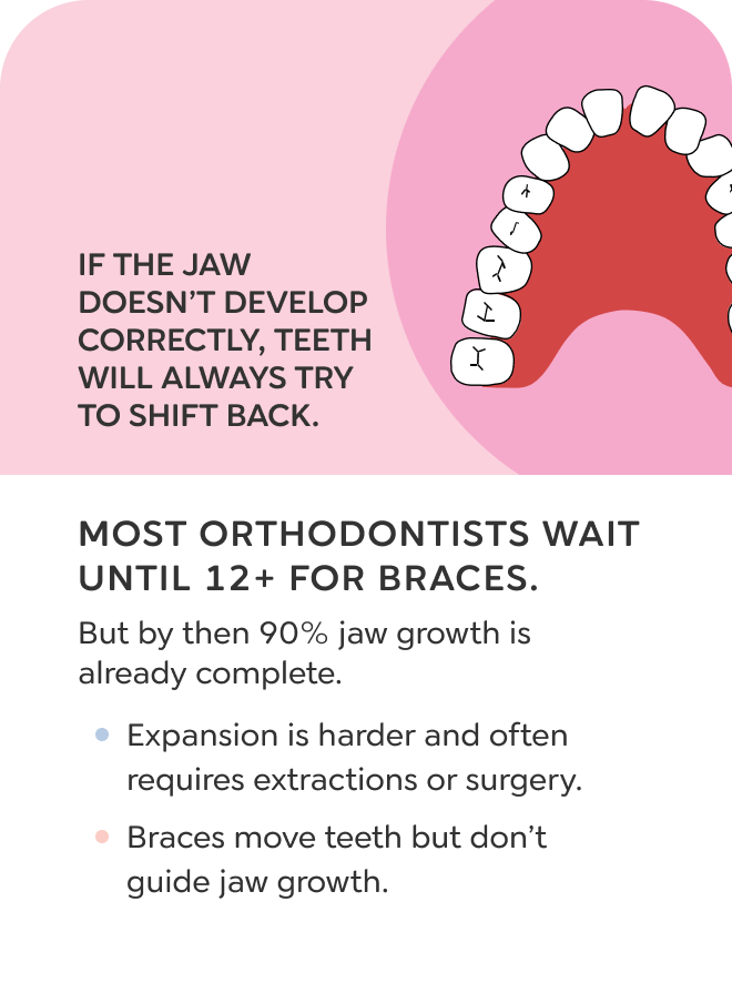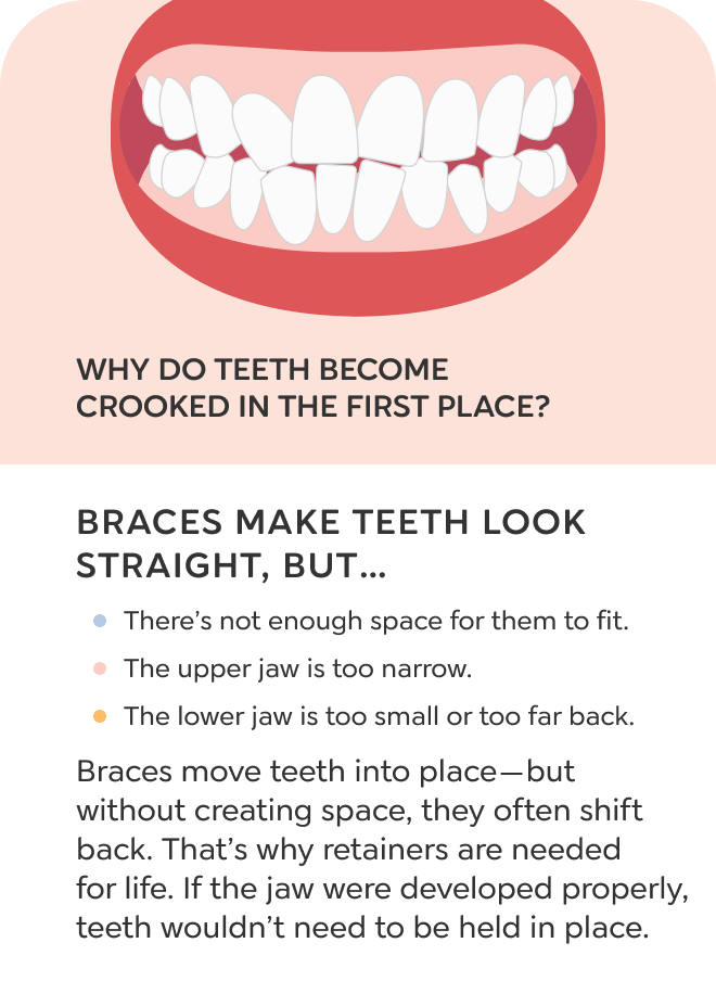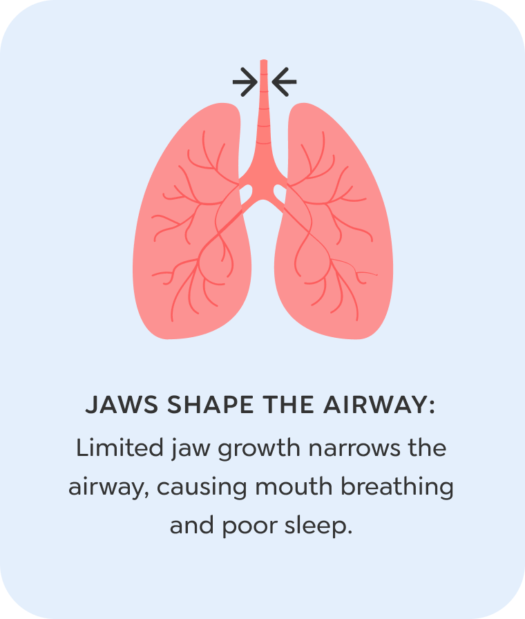 Crooked teeth are often the earliest visible sign of underdeveloped jaws. They tell us that growth has not kept up with the body’s needs. Small jaws also leave less space for the tongue and airway, increasing the risk of mouth breathing, poor sleep, and long-term health effects.