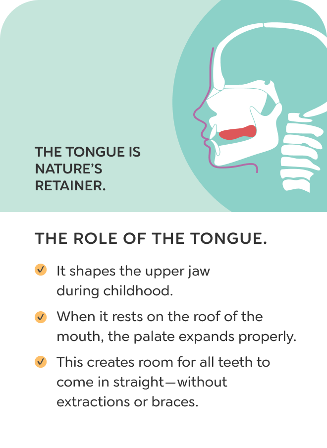 The upper jaw, or palate, is shaped by the tongue pressing against it during rest. If the tongue sits low in the mouth or the child breathes through the mouth instead of the nose, the palate stays narrow and the dental arch doesn’t widen the way it should. When forward growth is also restricted, the jaws become too small for both the teeth and the airway.