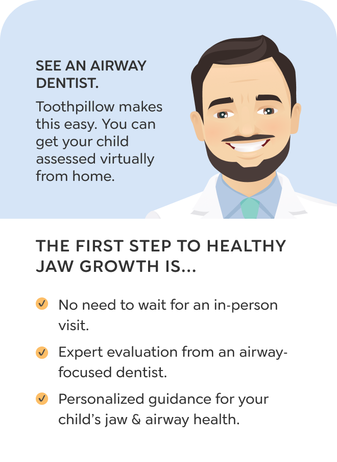 Toothpillow is a dentist-guided airway program that helps your child grow in a way that supports better breathing, deeper sleep, and healthier development—without surgery or traditional braces. Proactive and family-friendly, it addresses root causes like jaw growth, tongue posture, and nasal breathing instead of just masking symptoms.
