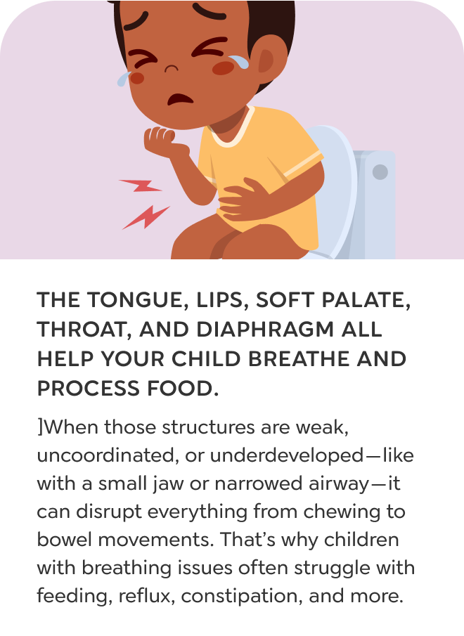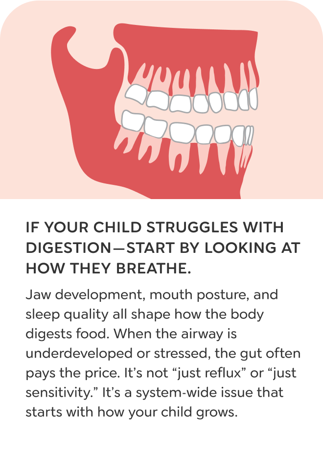 Reflux, constipation, bloating, and stomach pain are not always rooted in the gut. In children with disrupted breathing and poor jaw growth, these symptoms often begin higher up in the airway and nervous system.