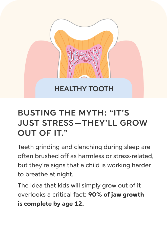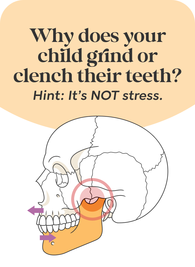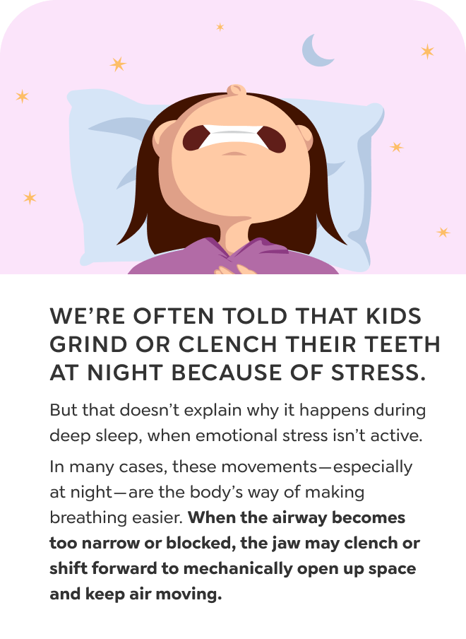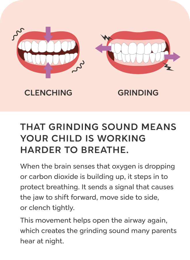 Grinding and clenching during sleep are often signs that a child is working hard to breathe. When the airway is narrow or unstable, the brain stays alert during sleep and activates the body to improve airflow. One of the ways it does this is by moving the lower jaw. That back-and-forth motion is what we recognize as teeth grinding.