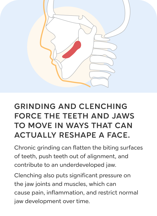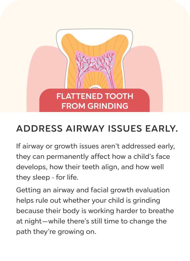 Children who grind their teeth often have underdeveloped jaws, low tongue posture, or signs of mouth breathing. Each grinding episode reflects a disrupted airway during sleep. While it may help in the moment, ongoing grinding can lead to restless sleep, daytime fatigue, and long-term damage to the teeth or jaw joints.