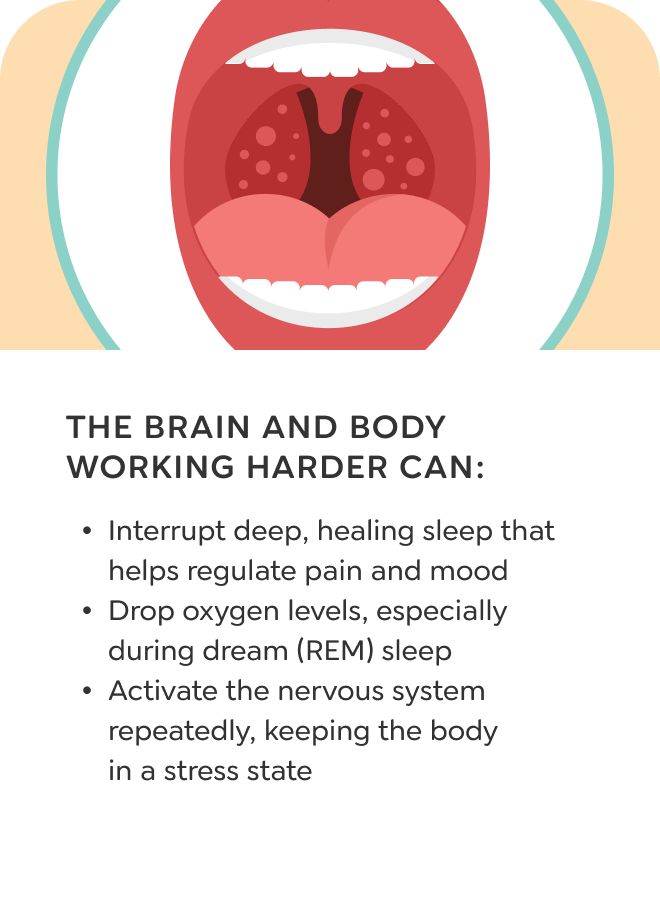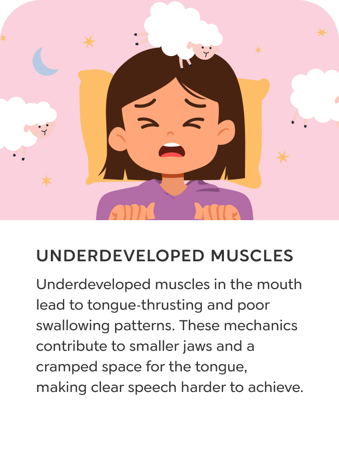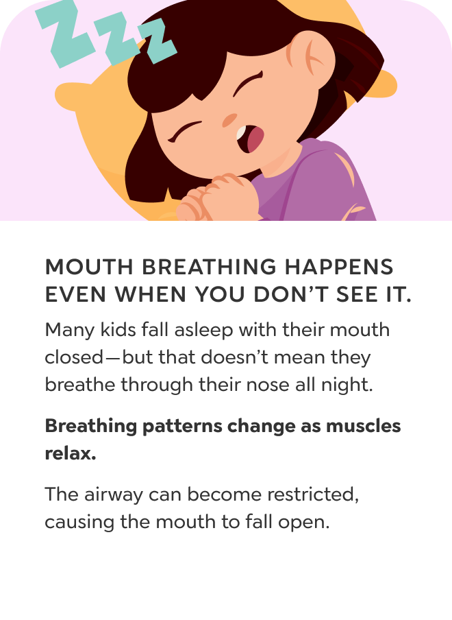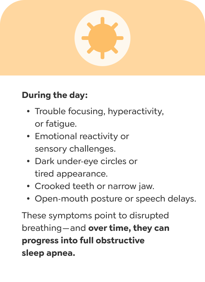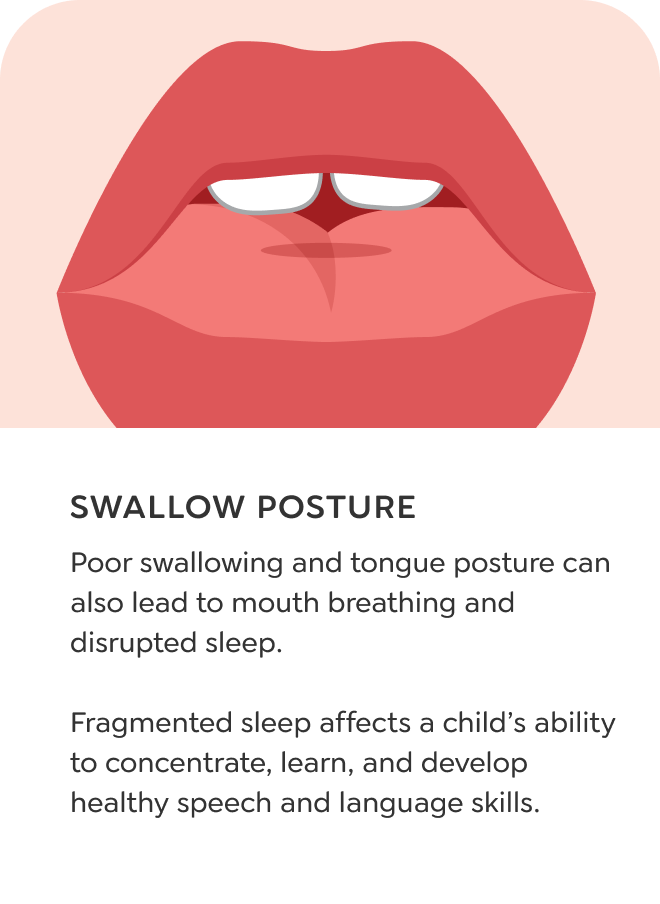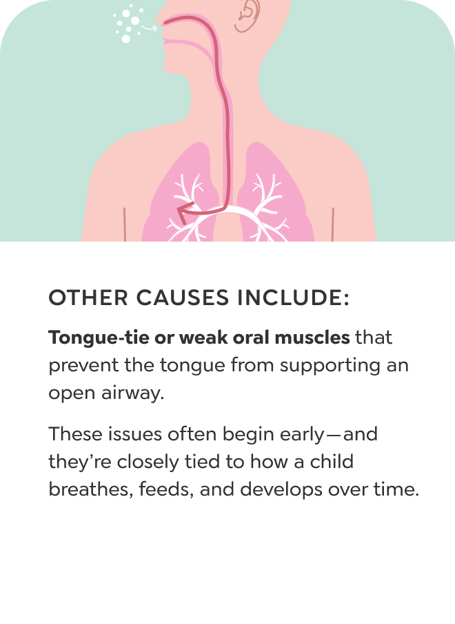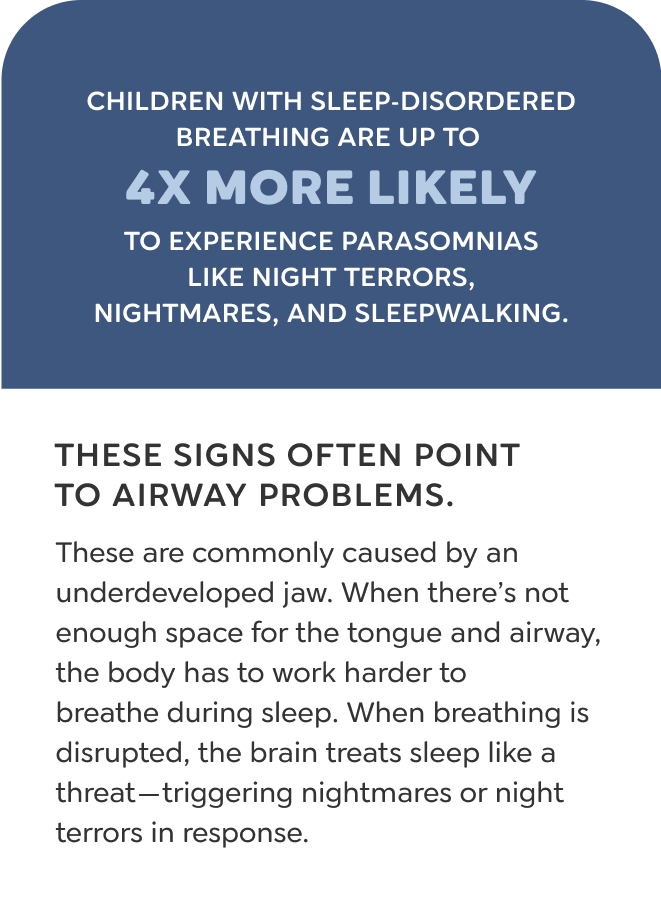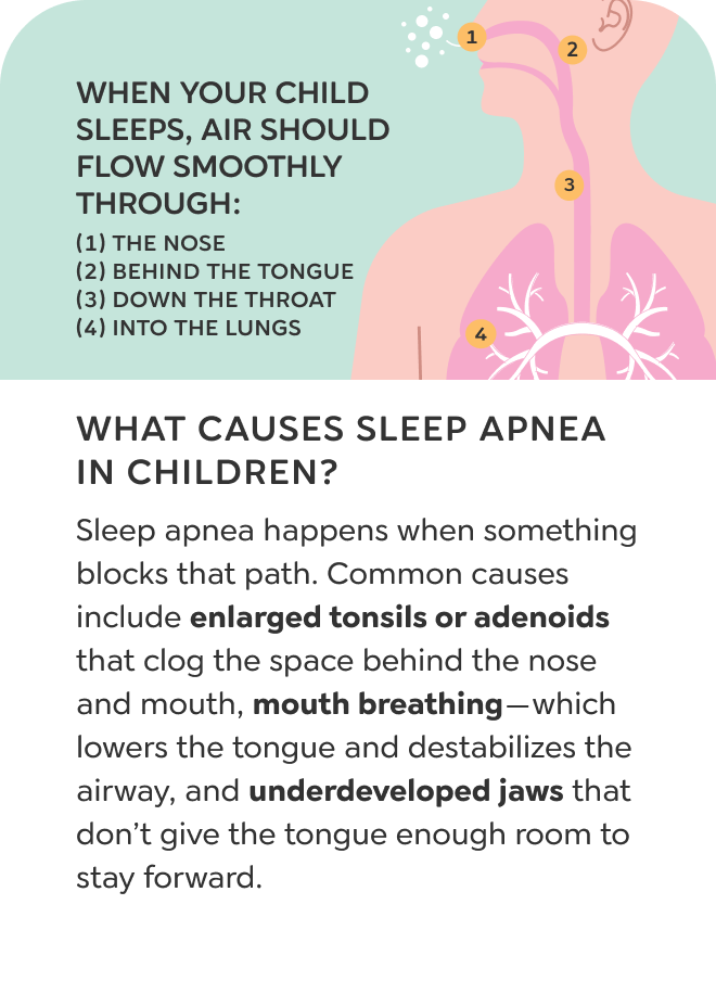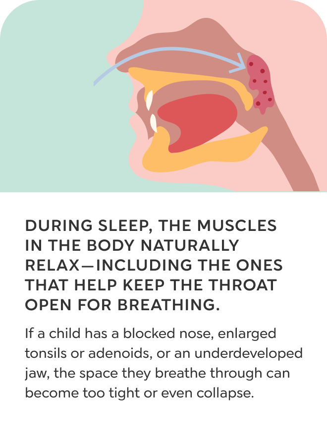 During deep sleep, your child’s tongue should rest against the roof of the mouth, helping keep the airway open. But when the jaw is underdeveloped, the tongue falls backward, shrinking the airway and leading to disrupted breathing