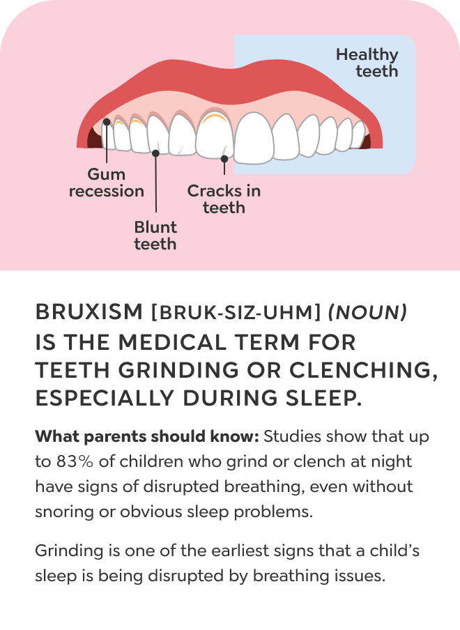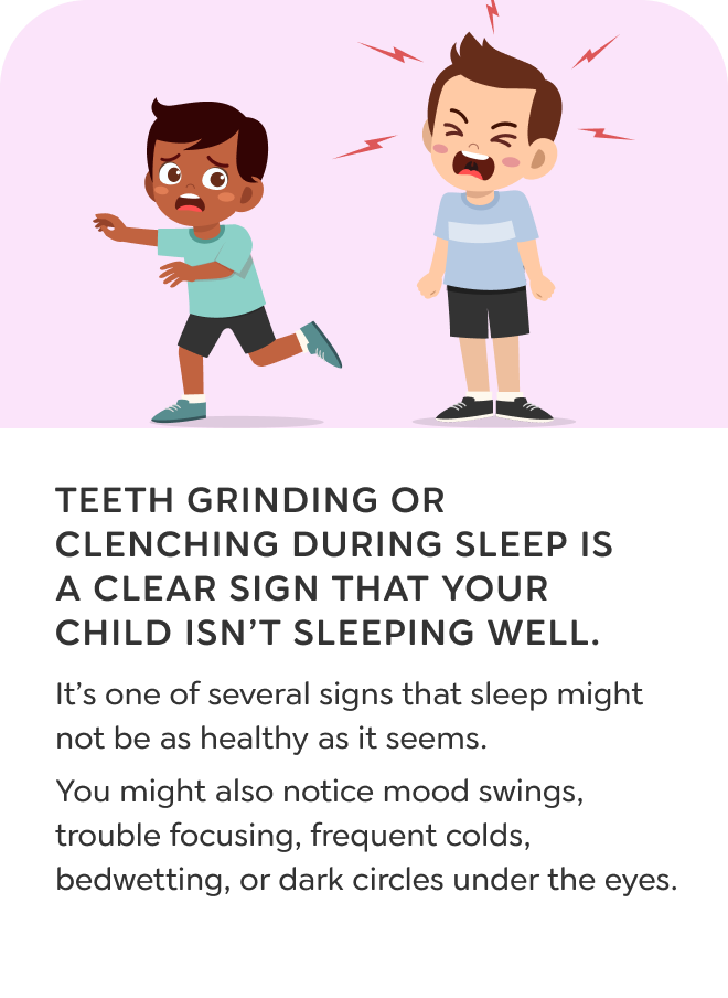 Your child clenches or grinds their teeth in their sleep, and it often sounds harsh or unsettling. This movement may be the brain's way of adjusting the jaw to open the airway and improve airflow during sleep.
