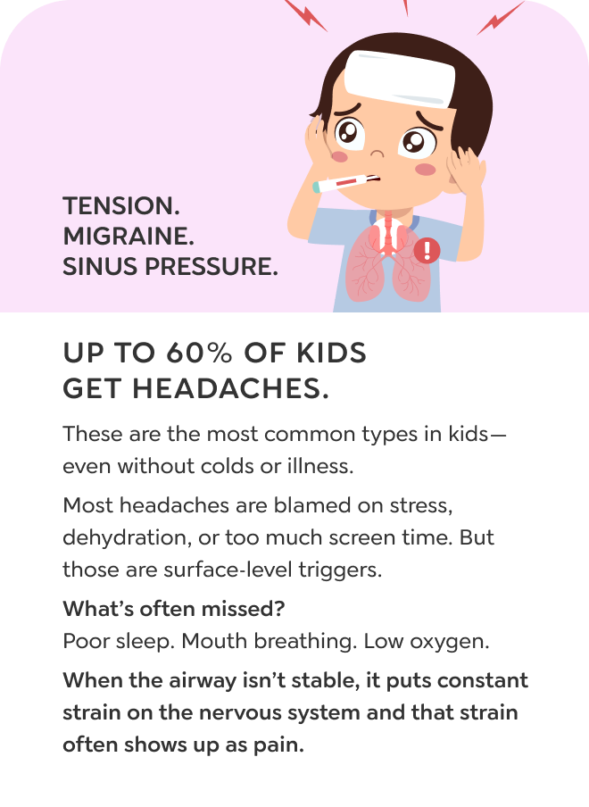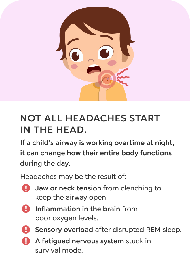 If a child has headaches alongside signs like snoring, grinding, or mouth breathing during sleep, it may be a sign that their airway is not supporting healthy breathing. Addressing the root cause can improve oxygen levels, sleep quality, and pain sensitivity throughout the day.