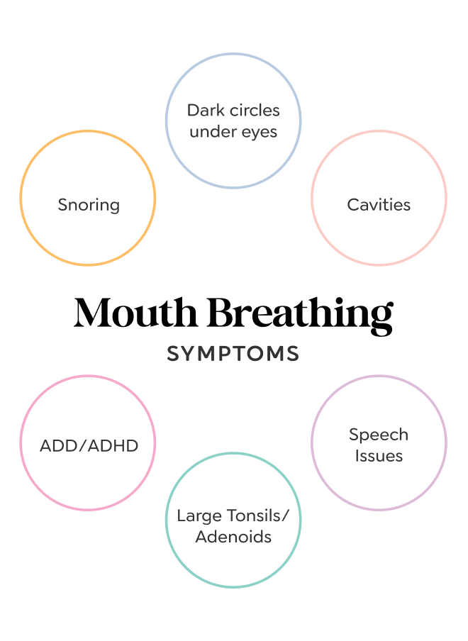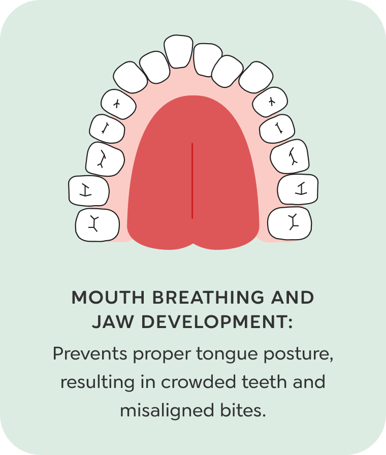 Over time, this shift changes how the face grows. The tongue no longer supports the roof of the mouth, so the palate narrows, the upper jaw stays small, and the airway becomes more restricted. Children who breathe through the mouth are more likely to develop fatigue, poor focus, dry lips, bad breath, and symptoms that resemble ADHD or behavioral disorders.