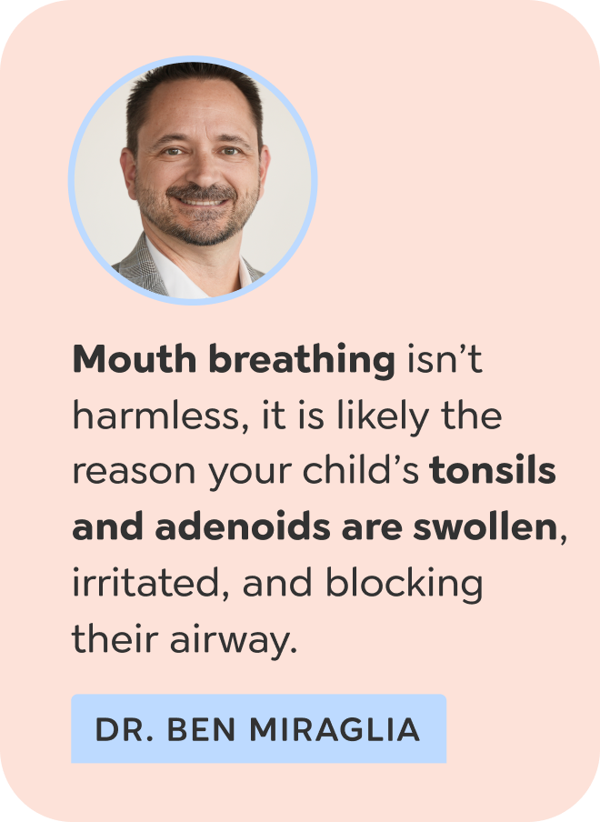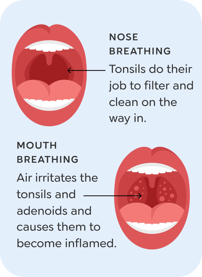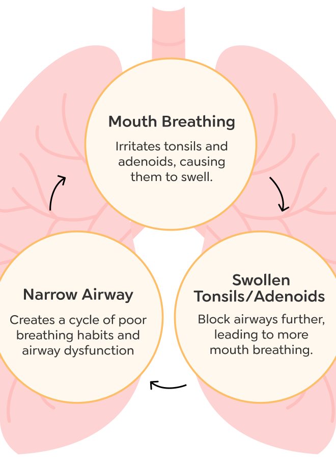 Large tonsils and adenoids are often blamed for airway problems, but in many cases, they are a result of poor breathing, not the cause. These tissues tend to enlarge when a child starts breathing through the mouth. Mouth breathing brings dry, unfiltered air into the throat, which irritates the tonsils and adenoids and causes them to swell.