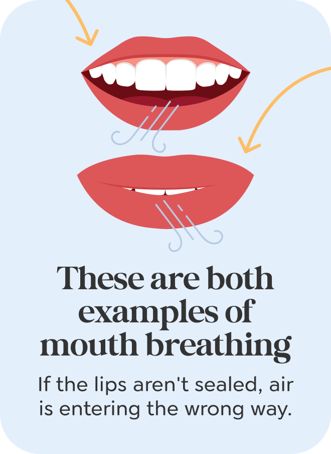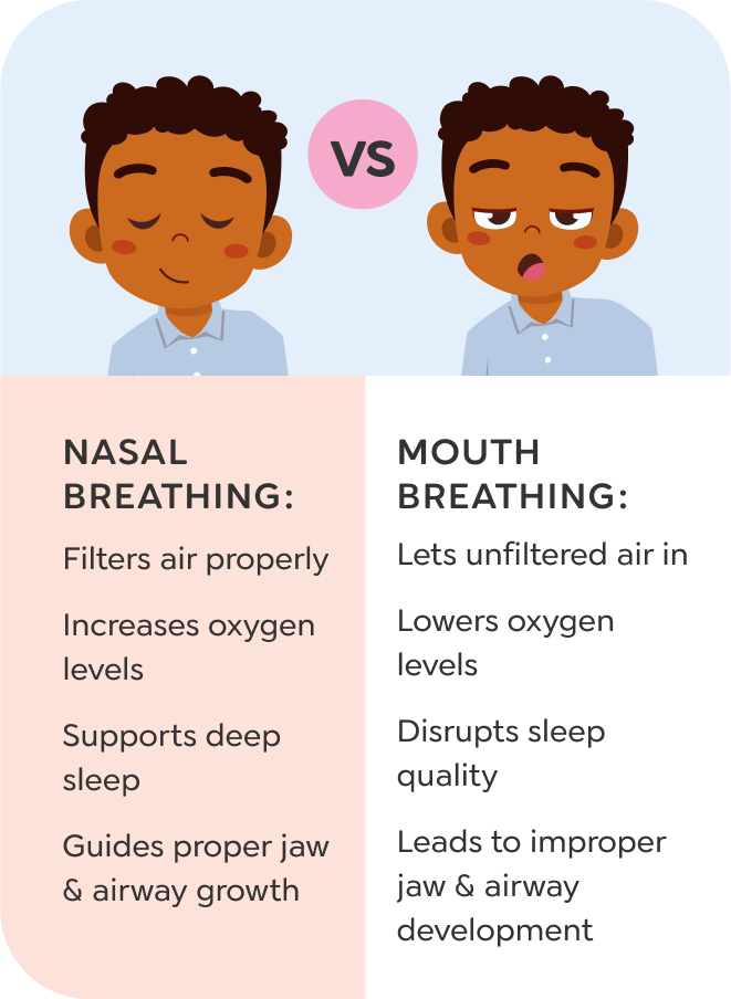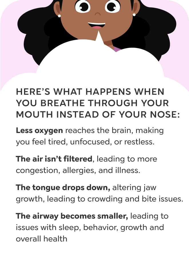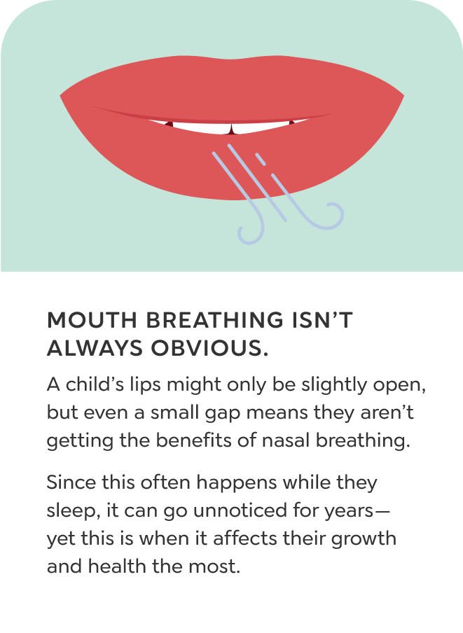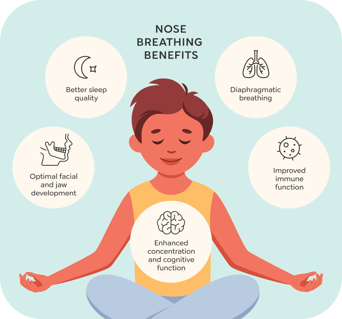 Children should breathe primarily through their noses. Nasal breathing filters air, optimizes oxygen absorption, and supports ideal facial growth.