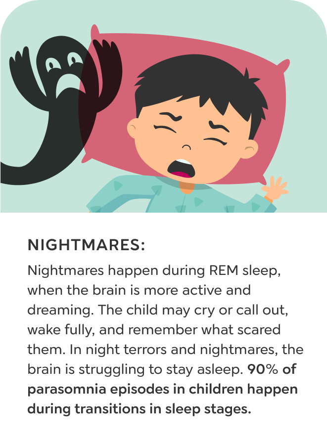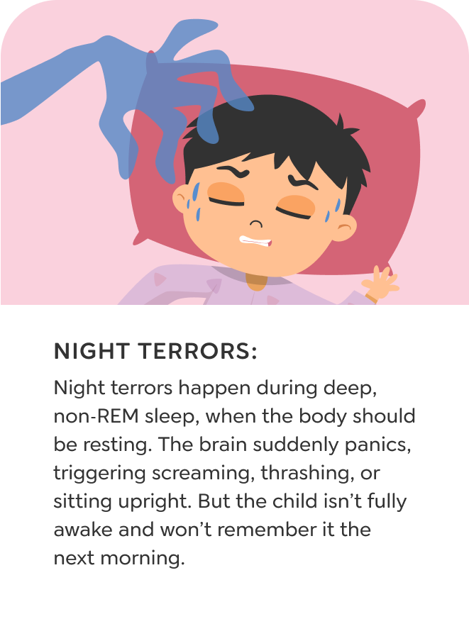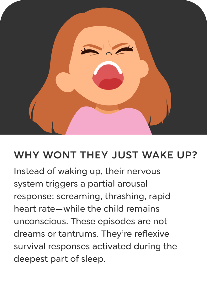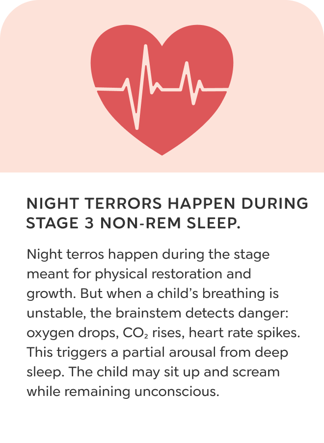 Night terrors are episodes where a child may cry out, sit up, or appear terrified during sleep, often without waking or remembering the event. These episodes tend to occur in the first half of the night, during transitions between sleep stages. While they are often labeled as neurological, many are triggered by sleep fragmentation caused by poor breathing.