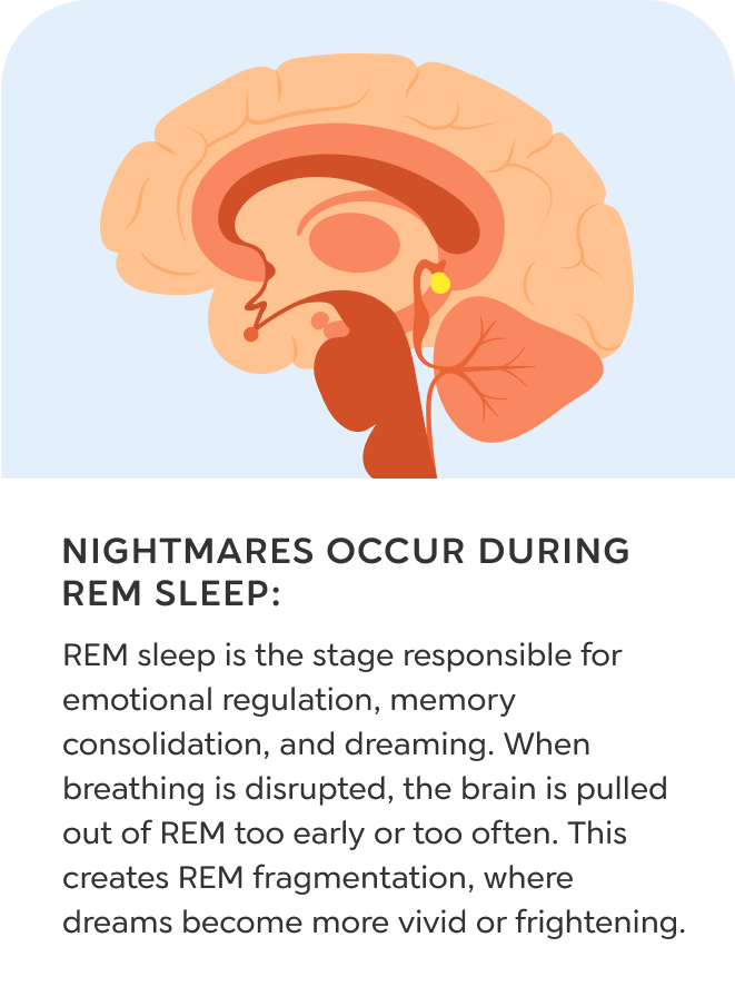 Children who breathe through their nose at night are more likely to move smoothly through each sleep stage, including deep sleep and REM, where dreaming occurs. But children who mouth breathe often struggle to maintain stable sleep cycles. As airflow becomes disrupted, the brain stays partially alert to keep breathing steady. That instability fragments the sleep cycle and interferes with dreaming.