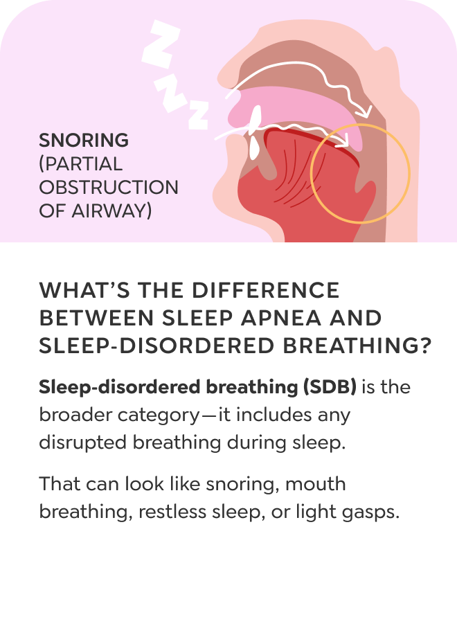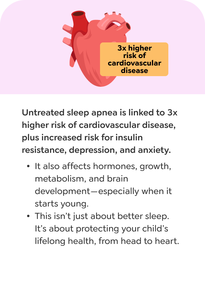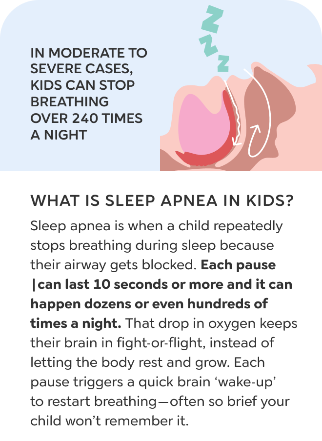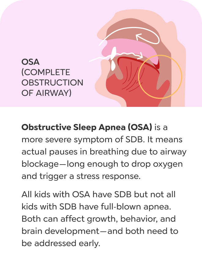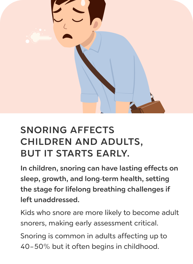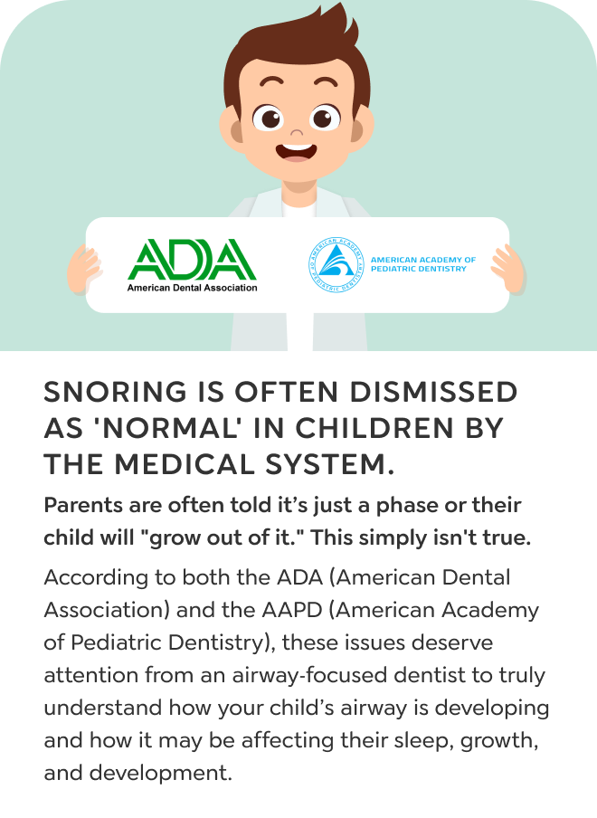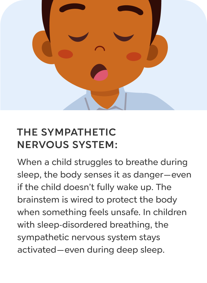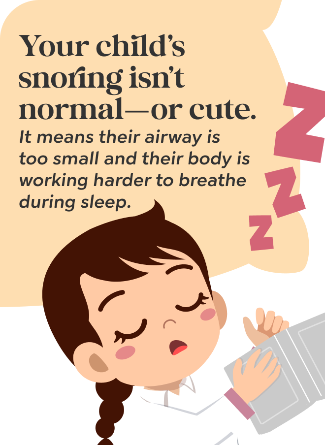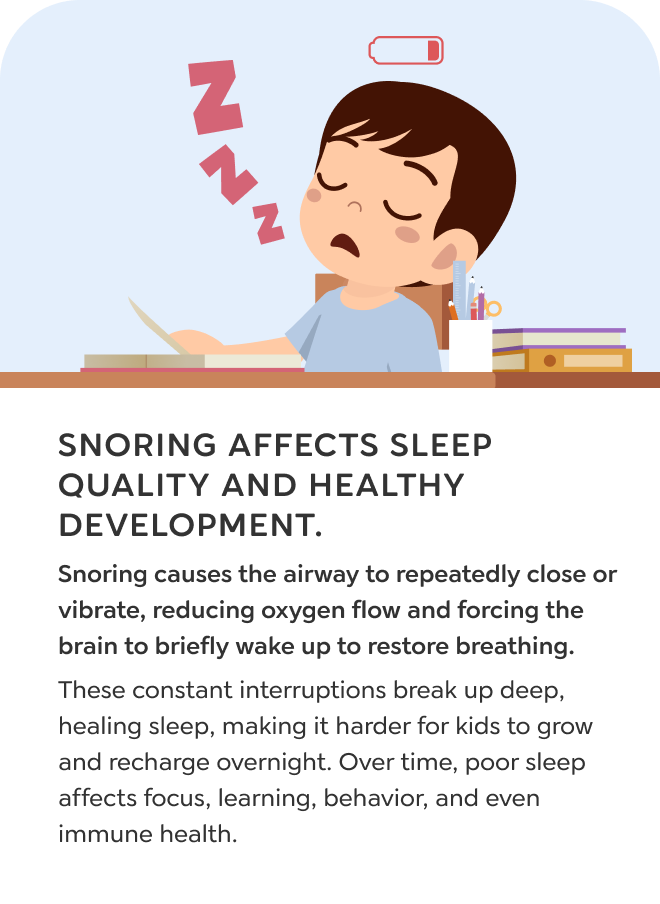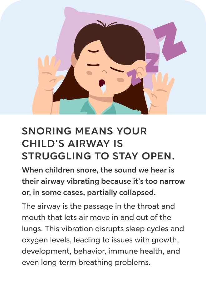 Snoring is one form of sleep-disordered breathing. Every episode of snoring causes a drop in airflow, triggering the brain to interrupt sleep and restore breathing. These disruptions prevent the body from reaching the most restorative stages of sleep and can impact growth, hormone production, behavior, attention, and immune function—even if your child appears to sleep through the night.