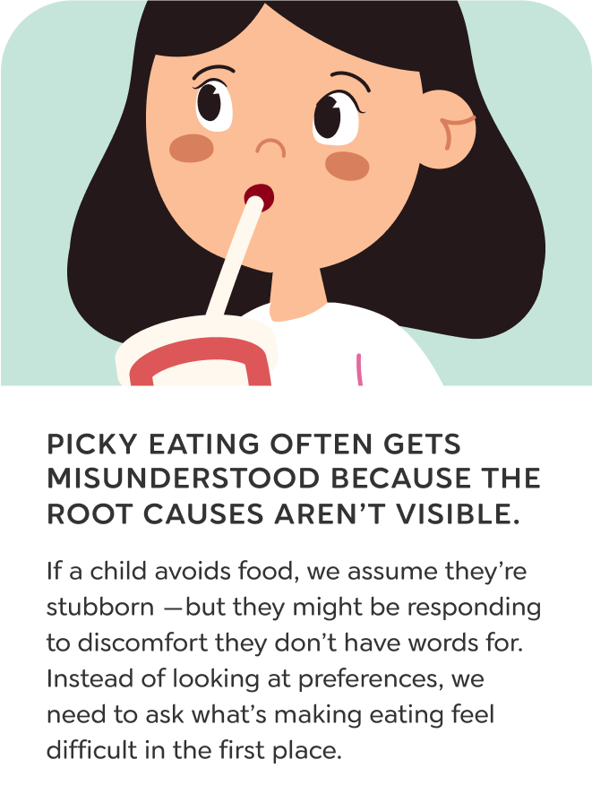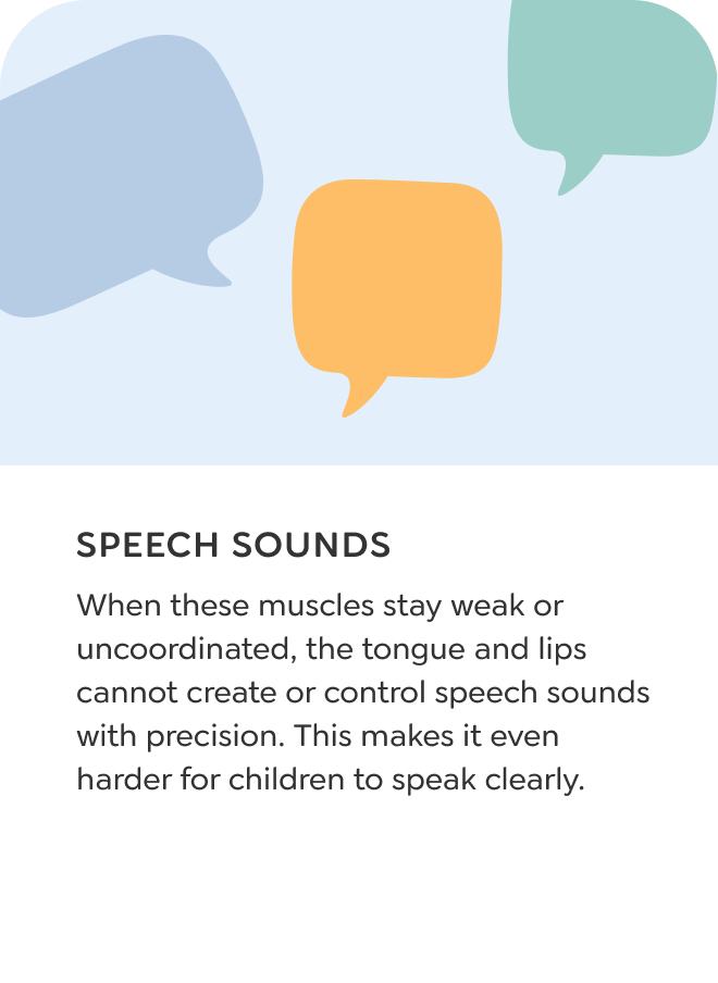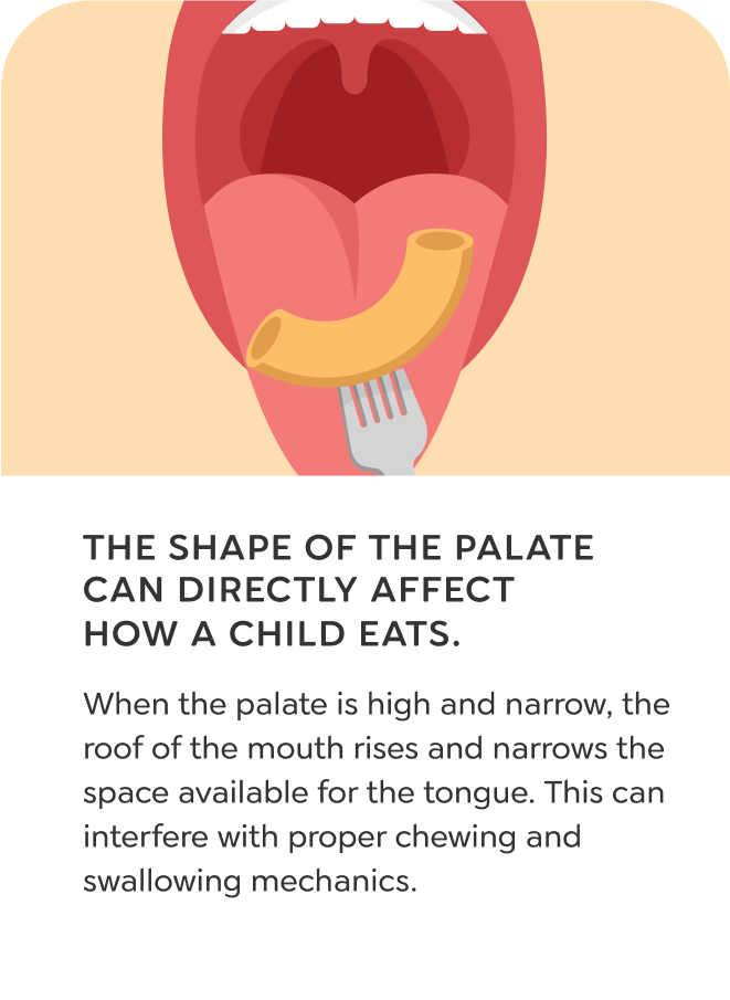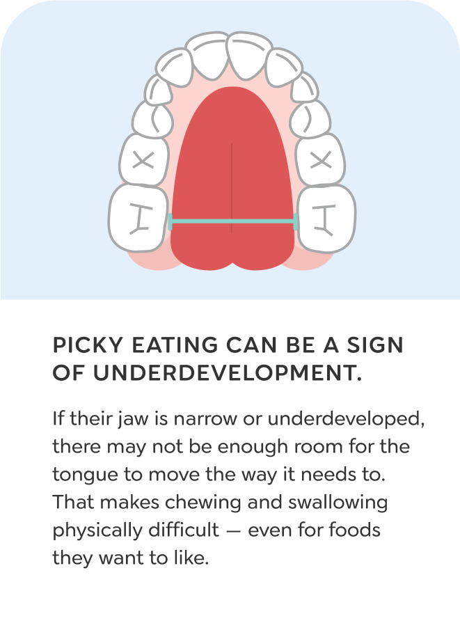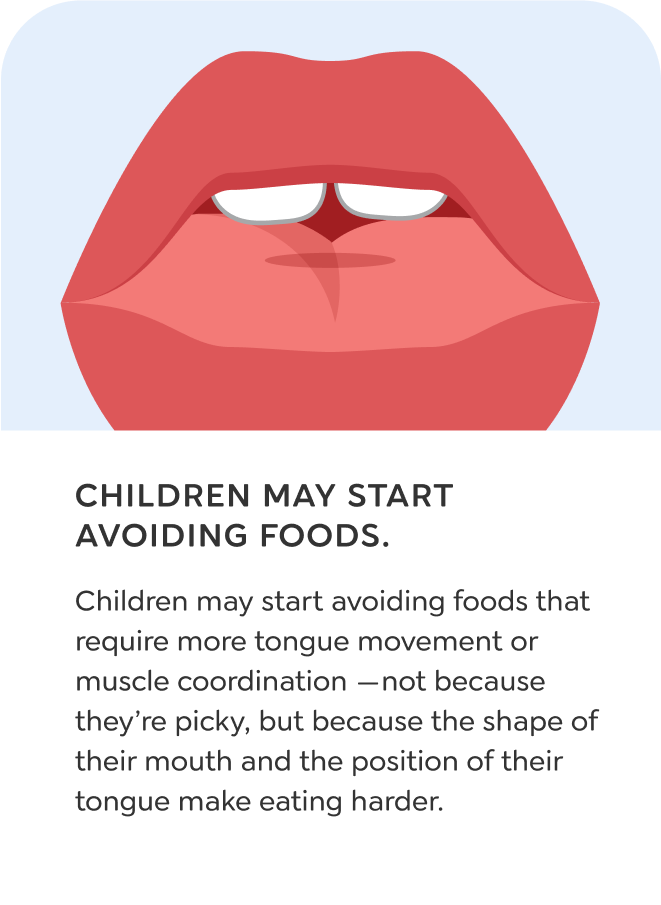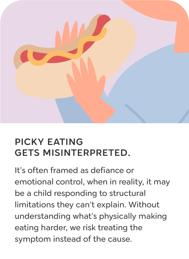 As the mouth struggles to manage more challenging textures, the range of accepted foods narrows. Picky eating is often one of the earliest signs that the muscles and structures used for eating didn’t develop the way they should.