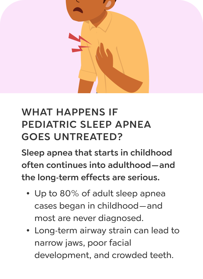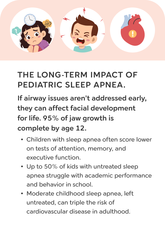 While only a small percentage of children meet the criteria for a sleep apnea diagnosis, many more are on the same path. Mouth breathing, snoring, and disrupted sleep are early signs of an airway that is too small. Without proper growth, the risk of long-term sleep and breathing problems increases over time.