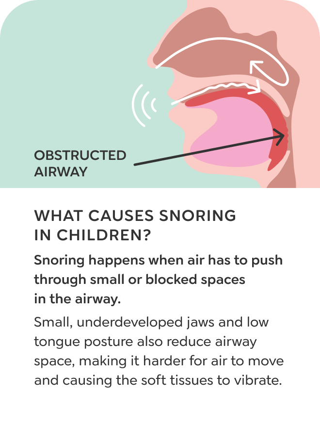 Snoring in children is a sign that the airway is physically too narrow for healthy breathing. As air moves through a restricted space during sleep, it causes soft tissue in the throat to vibrate. That vibration means airflow is being forced through a small space, increasing resistance and putting strain on the body’s ability to breathe.
