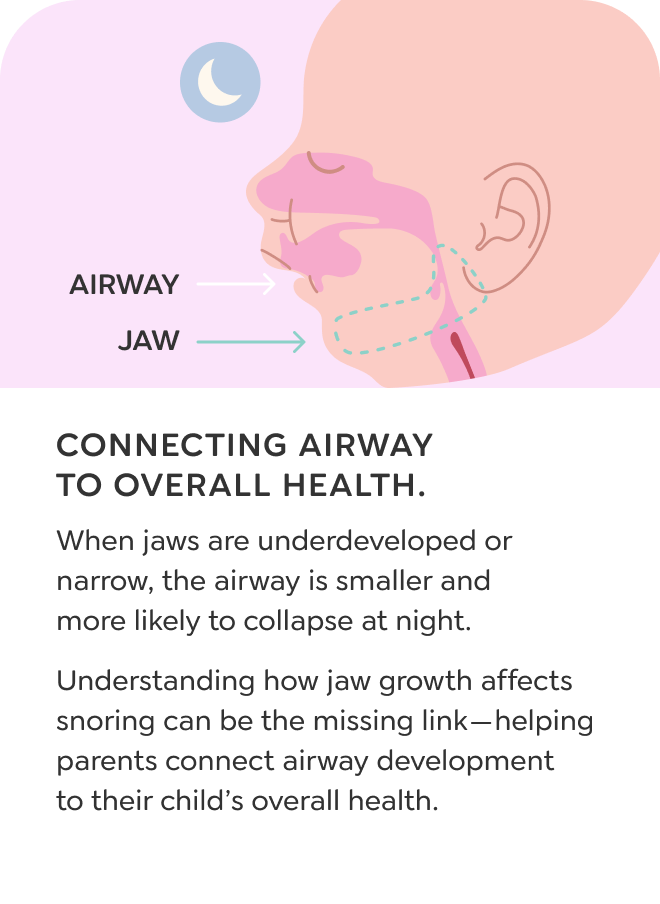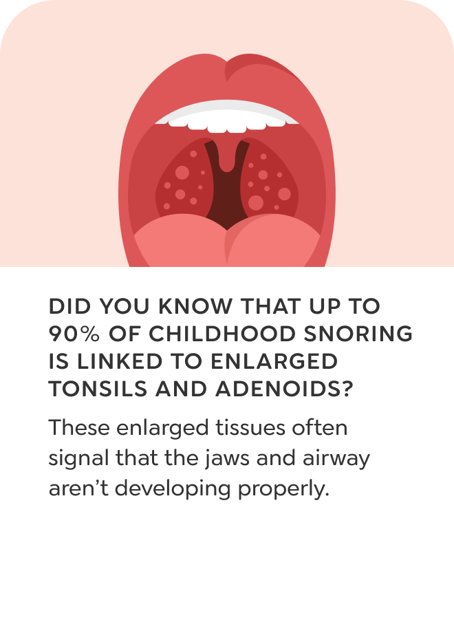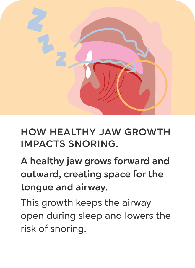 Snoring often reflects a structural issue. When the upper and lower jaws don’t grow forward enough, there isn’t enough space for the tongue or the airway. If the tongue falls back during sleep or the tonsils are enlarged, the airway becomes even smaller and more prone to collapse.