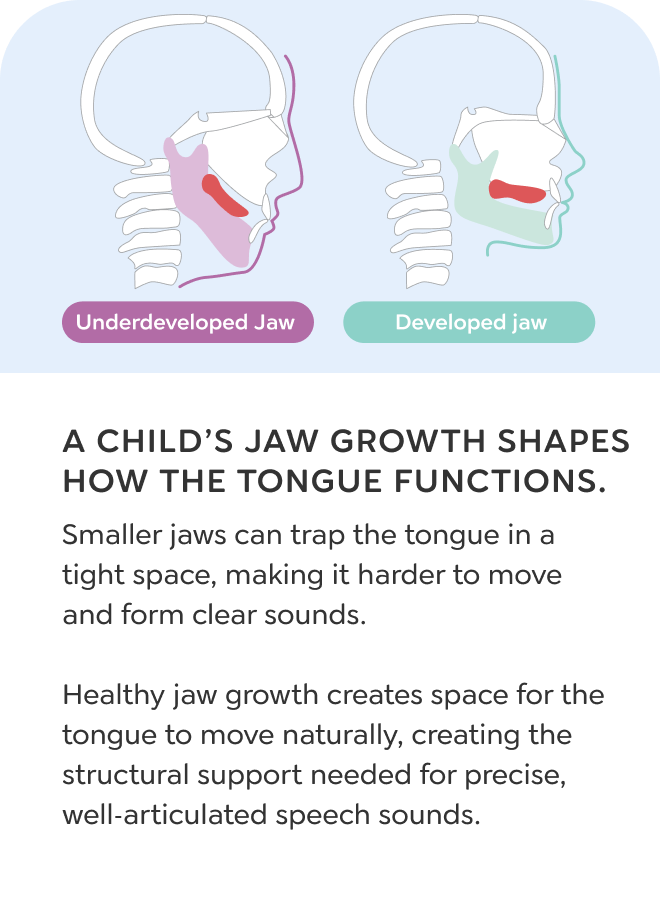 Some children struggle to speak clearly because their mouth doesn’t give the tongue enough space to move. When the jaws are small or underdeveloped, the oral cavity becomes too crowded. A normal-sized tongue working in a smaller space has trouble reaching the right positions for clear sounds. This can make it harder to pronounce letters like L, R, S, SH, or TH. Underdeveloped jaws can also affect the angle of the Eustachian tubes, making it harder for fluid to drain properly. When drainage is poor, hearing can be reduced—and hearing loss during early development often delays speech. Chronic nasal congestion and narrow airways can also change how a child sounds, especially if the voice is nasal or muffled. Ties in the tongue, lips, or cheeks can further limit the precise movements needed for clear articulation.
