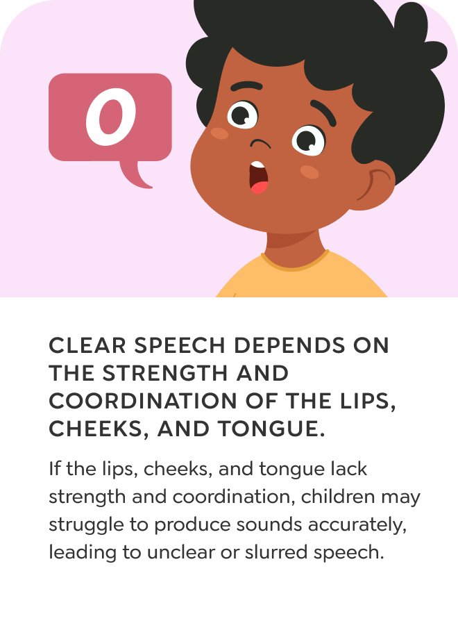 This usually starts in infancy. If a child spends a long time eating purees or soft foods, the tongue muscles don’t get the training they need. Without proper strength or movement, the tongue tends to sit low in the mouth and can’t guide or clear food effectively. Jaw development may also be limited, especially in children who breathe through the mouth instead of the nose.